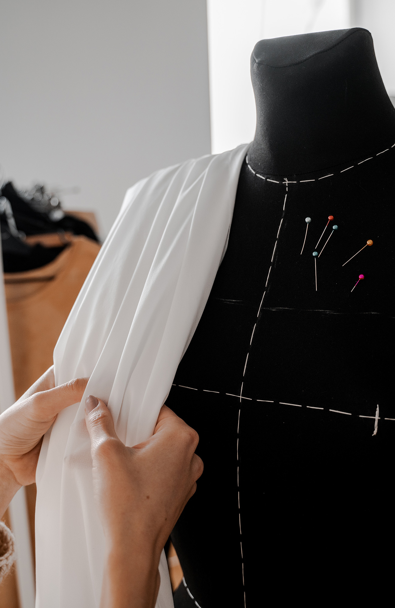 È una tecnica manuale con il quale il tessuto viene scolpito direttamente sul manichino sartoriale mediante l’uso della tela o di un tessuto, degli spilli e di una forbice con cui si può realizzare un abito in un unico pezzo trasformandolo in forme geometriche e in creazioni fluide e perfette.